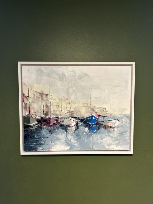 My fascination with fishing and sailing boats began from my interest in their geometry and rigidity in contrast with the fluidity of the sea. This rigid reflection, distorted by their host, straight lines zig-zagging at the gentle rock of a tide; the inevitable influence of our environment, serene in solitude but always shaped by other forces. I use objects and scenes in paintings as a sociological reflection and metaphors of being human. The boat remains a boat, but it’s colours will change by the sun and sea, it’s reflection will move with the waves and it’s existence will be marked by the storms it will endure… The mountains and hills will dive into the sea, solid foundation always eroding and changing…