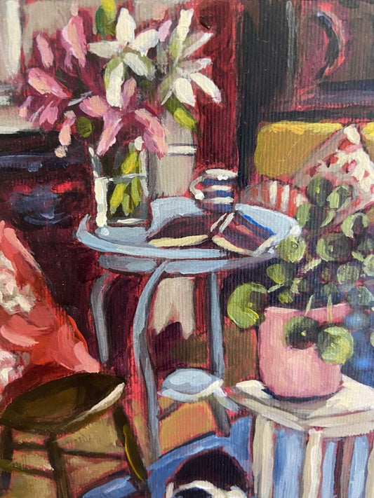 I am an Irish self taught artist who has made Cork city my home. I have been painting for many years and I am inspired by my surroundings. This could be a cosy corner of my home or a ray of sunshine shining through a petal. I like to use colour to elevate the ordinary into the extraordinary.